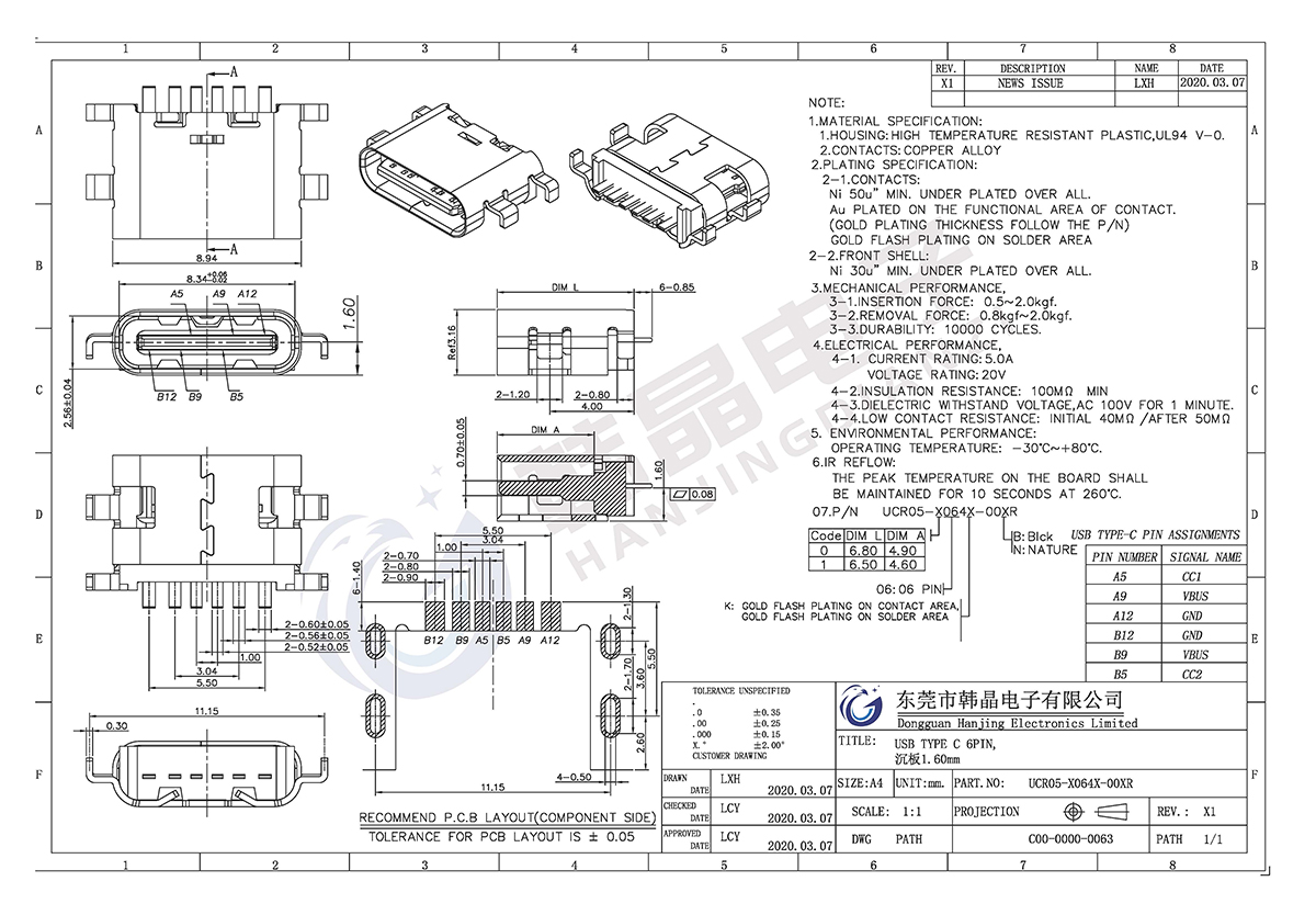 • TYPE-C6PIN L-6.8mm沉板1.6mm 型號(hào):UCR05-X064X-00XR-6.8