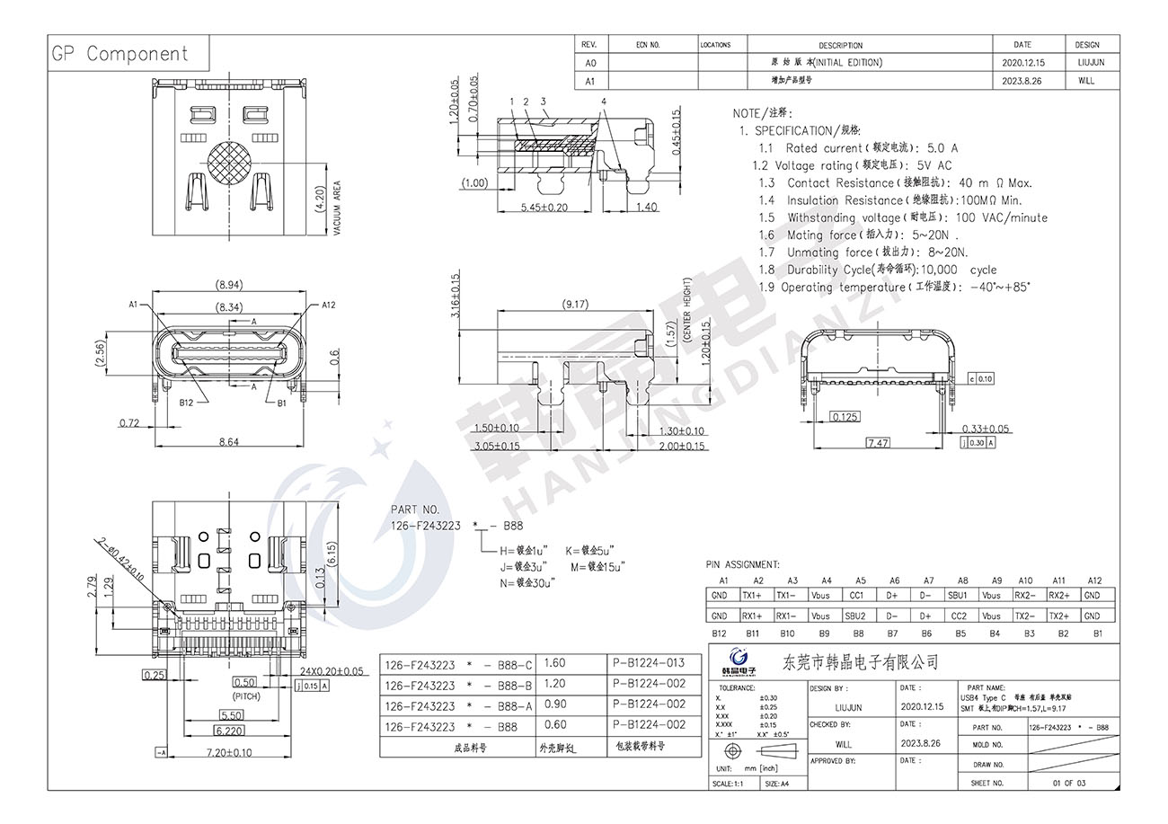 • B88(ABC款)USB4 Type C 母座 有后蓋 單殼 雙貼SMT 板上,有DIP腳 CH=1.57,L=9.17 型號:126-f243223X-B88