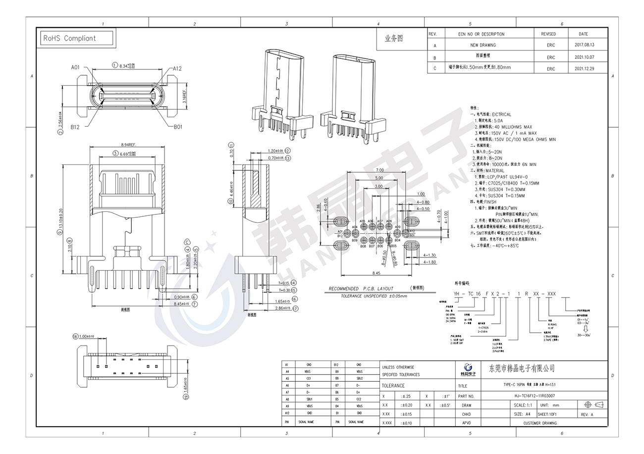 絕緣體材料: LCP, PA9T UL94 v-0