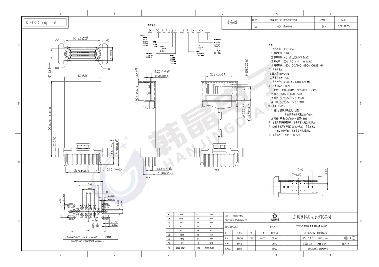 絕緣體材料: LCP, PA9T UL94 v-0